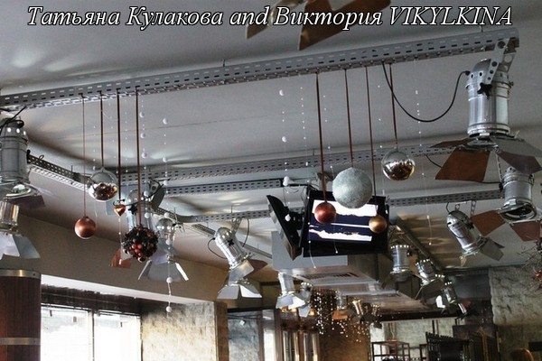 Проект вила моя коллега Татьяна Кулакова.Вместе мы придумали концепцию оформления,сразу встал цвет-бронза,шоколад,красный.Всё натуральное.Сухо цветы,натуральные ветки,шарики ротанга,шашки,закрутки из берёзовых веток.Сбор материала для нашего проекта,происходил в дачном посёлке,это была очень увлекательная,загородная поездка!!!Так же наше композиции были украшены красивыми блёстками,шарами,украшениями.Витрина с солодом,домиками и подвесными шариками,личная заслуга Татьяны.Мною же было изготовлины большие композиции над баром.Жаль нет подробных фото,нашего проекта.так же хочется высказать благодарность моей мамуле,и Наташе Бубновой.
